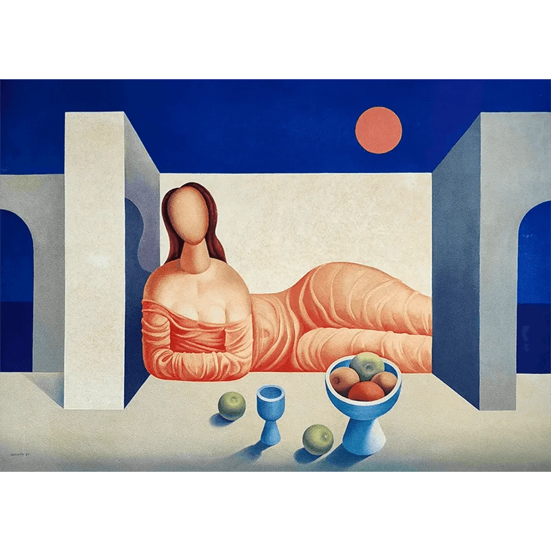 Grabado a color sobre papel en técnica offset de Mario Carreño. Año 1992. Papel texturado. Edición limitada numerada y firmada a mano. Cuño seco del editor. Título «Mujer al atardecer».