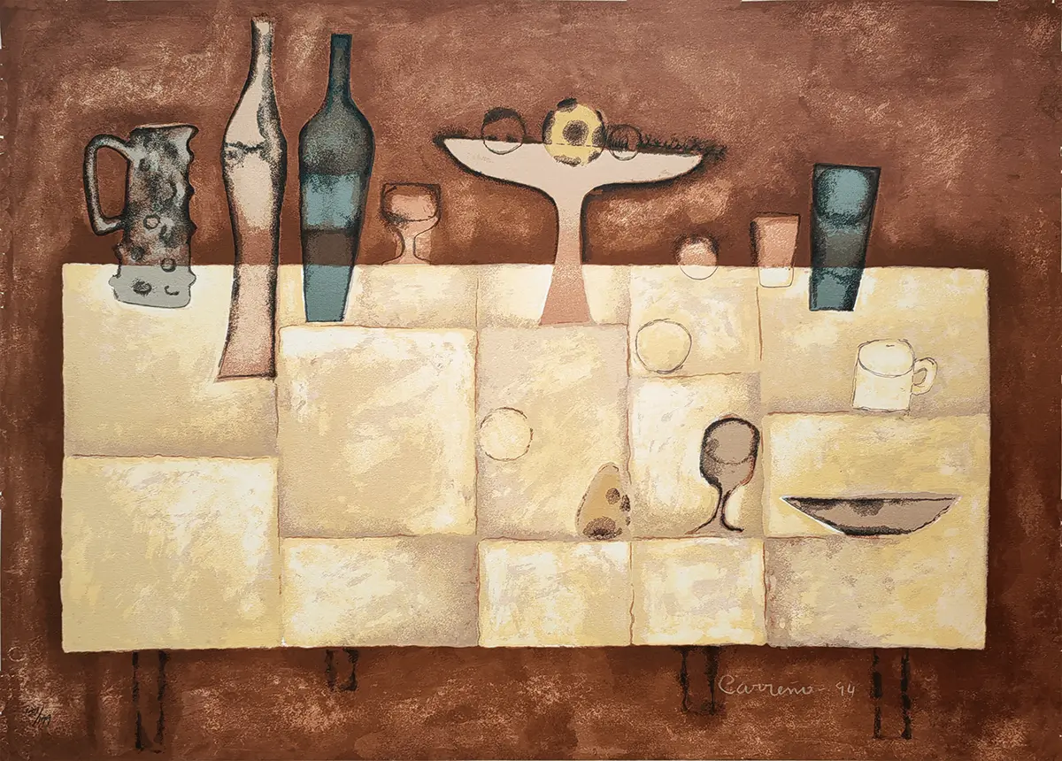 Serigrafía a color sobre papel de Mario Carreño. Año 1994. Papel Guarro. Realizada en La habana, Cuba. Edición limitada numerada y firmada a mano. Título «Mesón cubano».