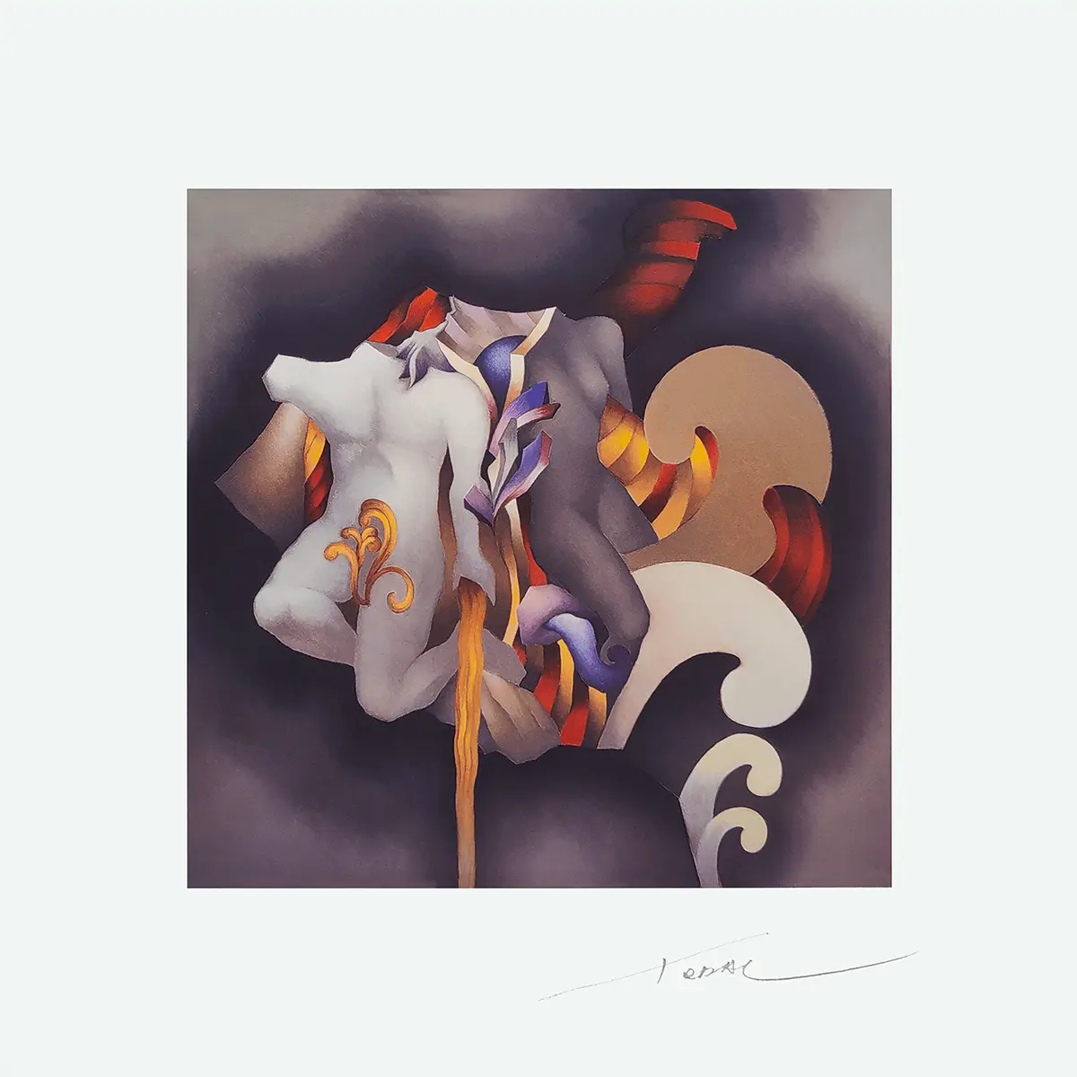 Grabado a color numerado y firmado a mano por el destacado artista chileno Mario Toral M. Efectuado en giclée a doce colores sobre papel de algodón. Título «Flores y cuerpos en el espacio».