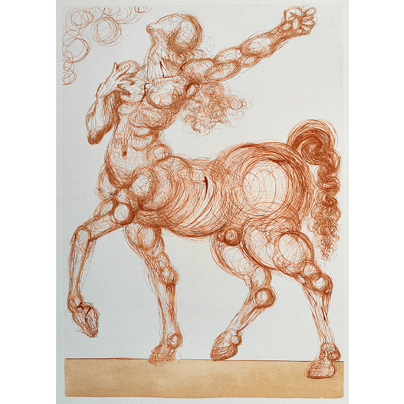Salvador Dalí, grabado en xilografía a color sobre papel de algodón BFK Rives, perteneciente a la serie La Divina Comedia. Editado por Les Heures Claires. Año 1963. Obra catalogada en The Official Catalog of the Graphic Works of Salvador Dalí y en DALI Catalogue Raisonné of Prints II. Lithographs and Wood Engravings 1956 – 1980. Edición limitada no firmada. Título «Le Centaure».